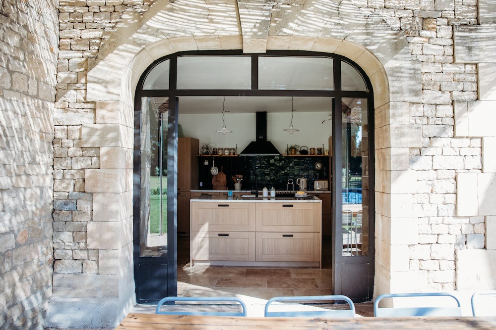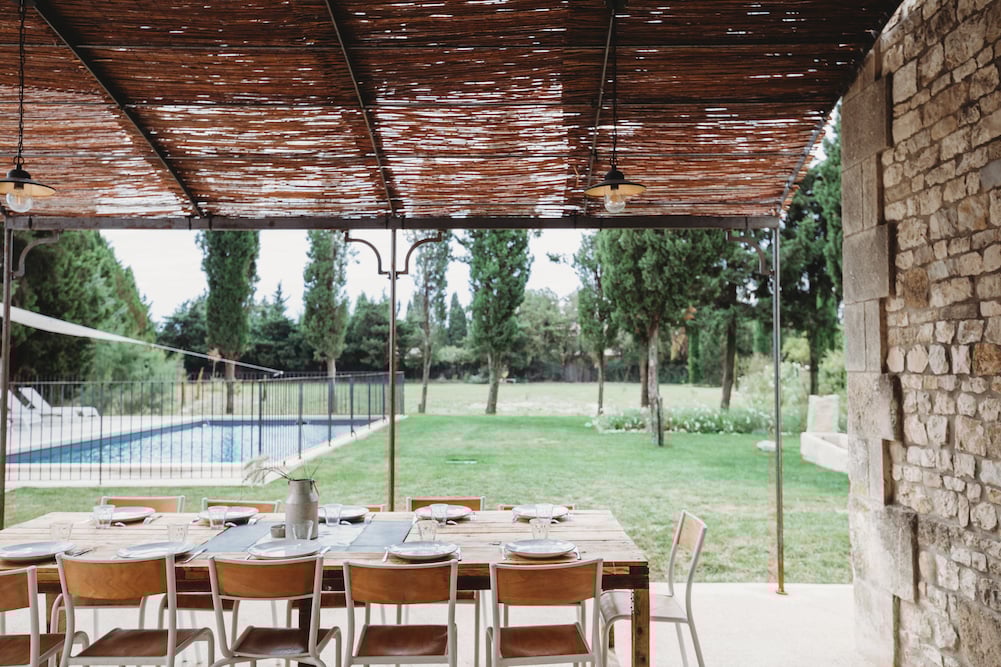 - Covered terrace adjacent to the kitchen, with a dining table and an electric plancha.