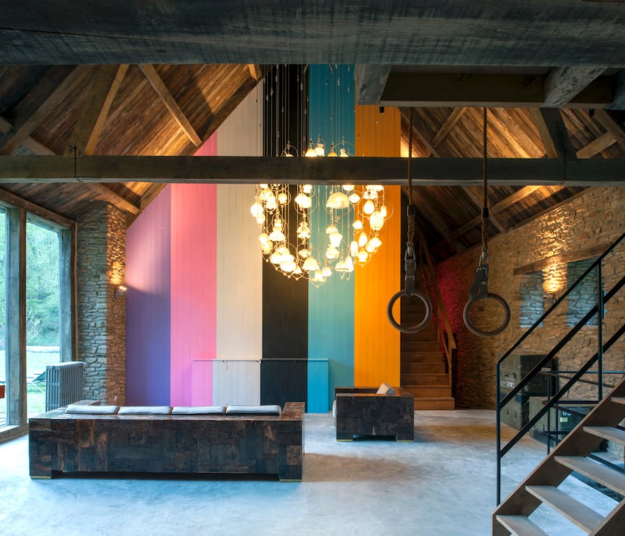 - The living room has a concrete floor and is furnished with a large sofa, a comfortable chair, an orange sideboard, impressive lighting and there are gymnastic rings (for sporty guests);