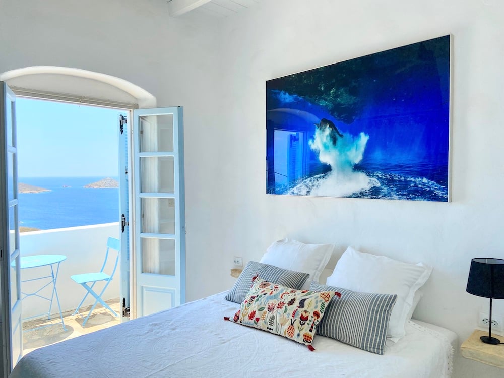- Master bedroom with a double bed (160cm x 200cm) and an en-suite bathroom with a shower, sink & WC. From here you can access the private balcony, which overlooks the sea. There is an en-suite bathroom with a shower, sink & WC.