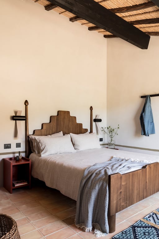 The design is a story in itself. The American owner and her Sardinian husband worked with local artisans, traditional techniques and natural materials to preserve the soul of the village. Wooden beams, hand-woven ceilings, terracotta floors and carefully selected design pieces give each house a character that feels both modern and timeless.