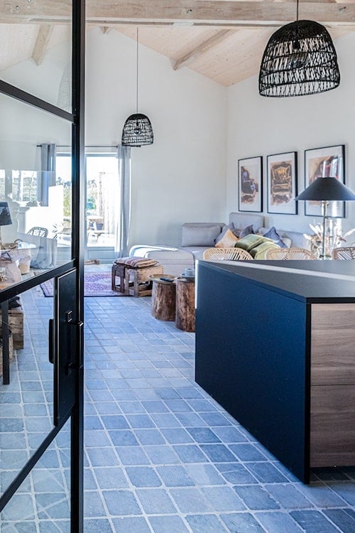- The open kitchen has a cooking island with 4 large wicker bar stools and an induction hob. The kitchen is equipped with all modern appliances such as an oven, refrigerator, freezer, and dishwasher.