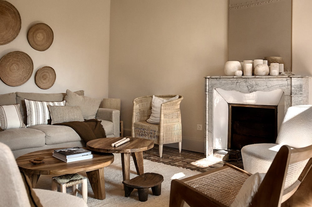 - A cozy living room with a sofa, armchairs, and a fireplace