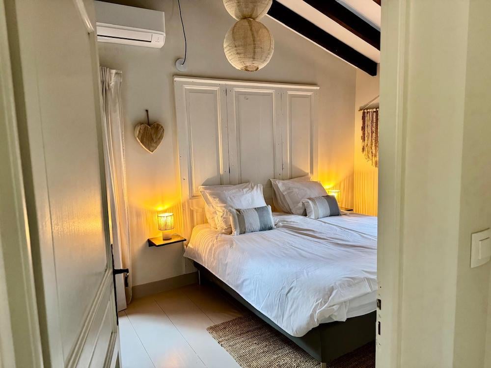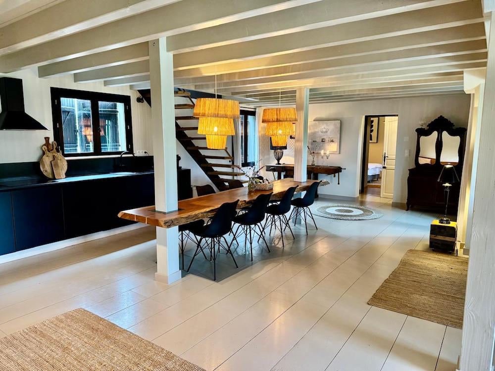 Inside, the house is spacious and atmospheric, with an open-plan living area that includes a sleek black kitchen, a long wooden dining table and a comfortable seating area. On the ground floor there is a stylish bedroom with en-suite bathroom; upstairs you’ll find two additional bedrooms, each with a king-size bed, tucked under the roof.