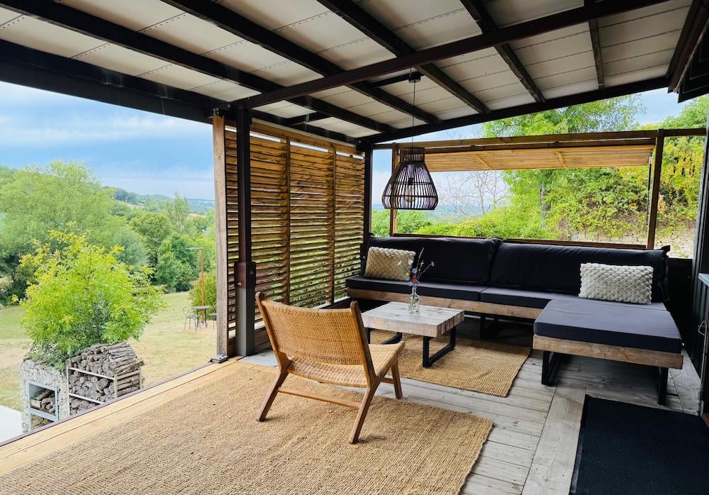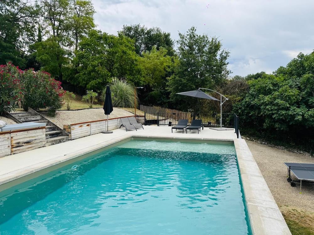 Outside, the large covered veranda forms the heart of the home—a wonderful place to lounge, read or enjoy meals together while taking in the hill views. A staircase leads down to a lower terrace with an outdoor kitchen and long dining table. One level below, you’ll find the pool with sun terrace — completely private, peaceful and surrounded by nature. Outside the high season (July/August, when the sun does its job), the pool can be heated for an additional fee. The area feels authentically French, with local markets, historic villages, canoeing, walking trails and easy trips to Villeréal and Bergerac. An ideal house for families or friends seeking peace and the charm of the French countryside.