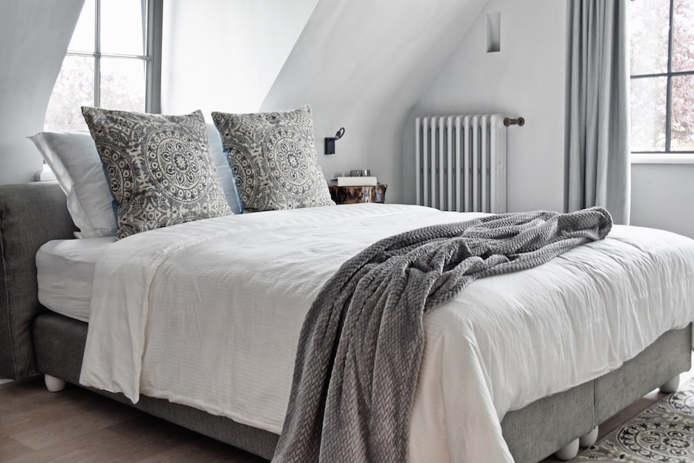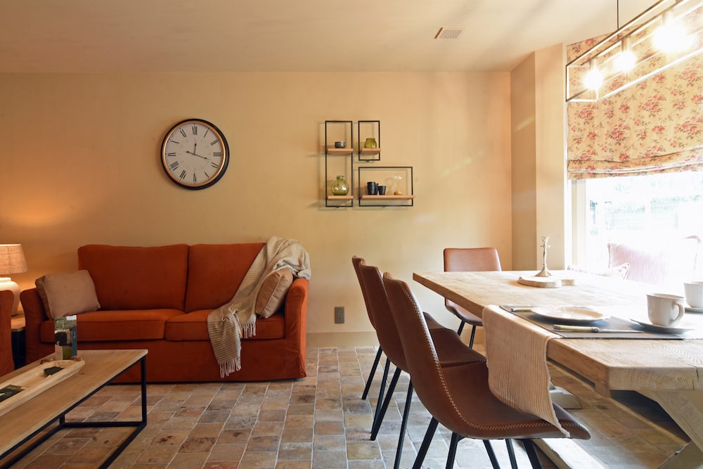 Mas Isa is an authentic country house quietly located in the middle of a natural environment in Limburg's Haspengouw region. The house - suitable for 8 people - consists of two separate buildings (called wings), connected by a red gate. In the right wing (the smaller building) there is a luxurious ensuite bedroom, a fully equipped kitchen and a living room. The right wing has a washing machine. In the left wing (the larger building) there are another 3 luxury ensuite bedrooms, a second fully equipped kitchen and a living room with a large table. From the kitchen you have access to the garden and a terrace. The left wing also has a washer and dryer. The two buildings are not connected to each other from the inside, so guests sleeping in the small building have to go outside for a while to reach the other building.