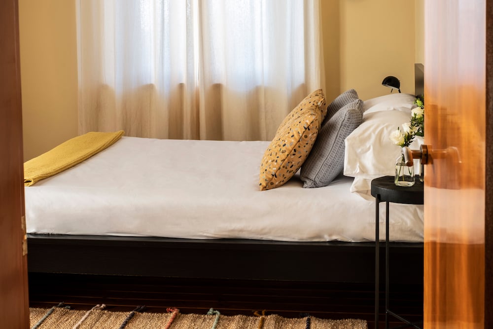 - Spacious bedroom with large windows, French balcony queen-size bed, and two single sofa beds (sleeps up to 4).