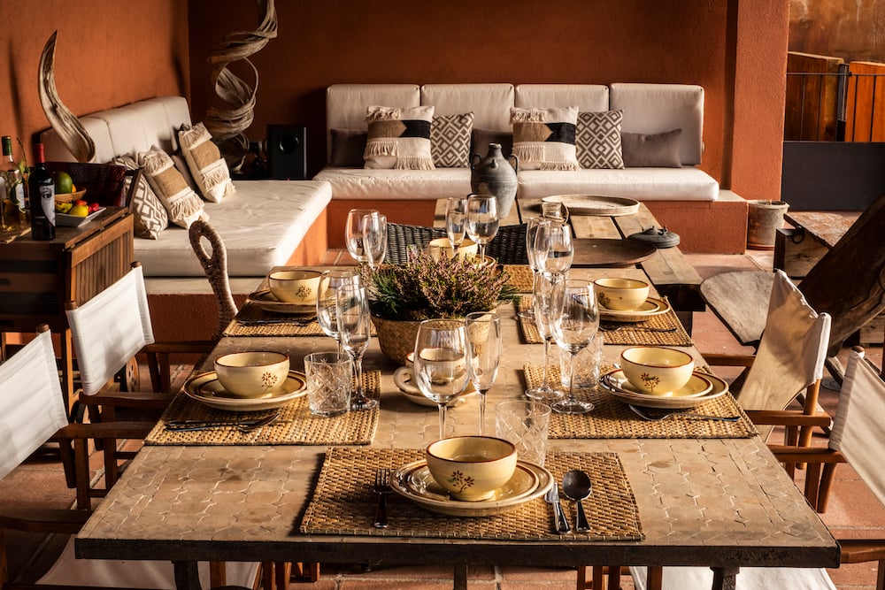 - Covered terrace with a lounge sofa, lounge chairs, and next to it a long table.