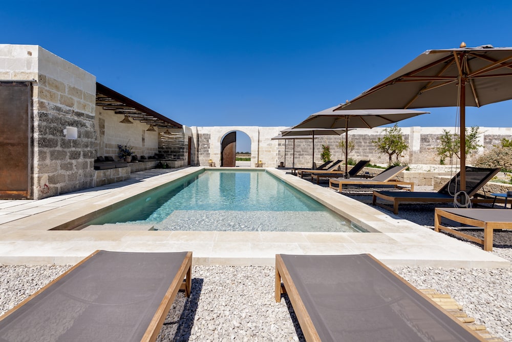 The Masseria consists of two buildings that together can accommodate 14 people. The house has a total of 6 bedrooms. One part of the Masseria has 3 very spacious bedrooms (two with a large private terrace), a magnificent living/dining room and a kitchen. The other part also has 3 ensuite bedrooms, a large designer kitchen and a living room. The bedrooms in both buildings are equipped with king-size beds, fine linens and cotton bedding. In the bathrooms you will also find bathrobes and grooming products from the Ortigia brand. Furthermore, the Masseria has Wi-Fi internet, a sound system, air conditioning and underfloor heating or radiators. The farmhouse is surrounded by 20 acres of private land and a courtyard garden with a swimming pool and pergola terraces with cozy corners for relaxing and dining. Upon arrival, a welcome pack with typical Apulian products is waiting for you!