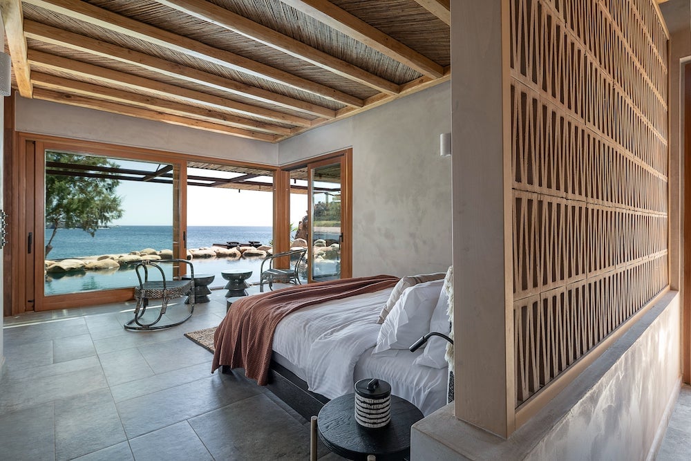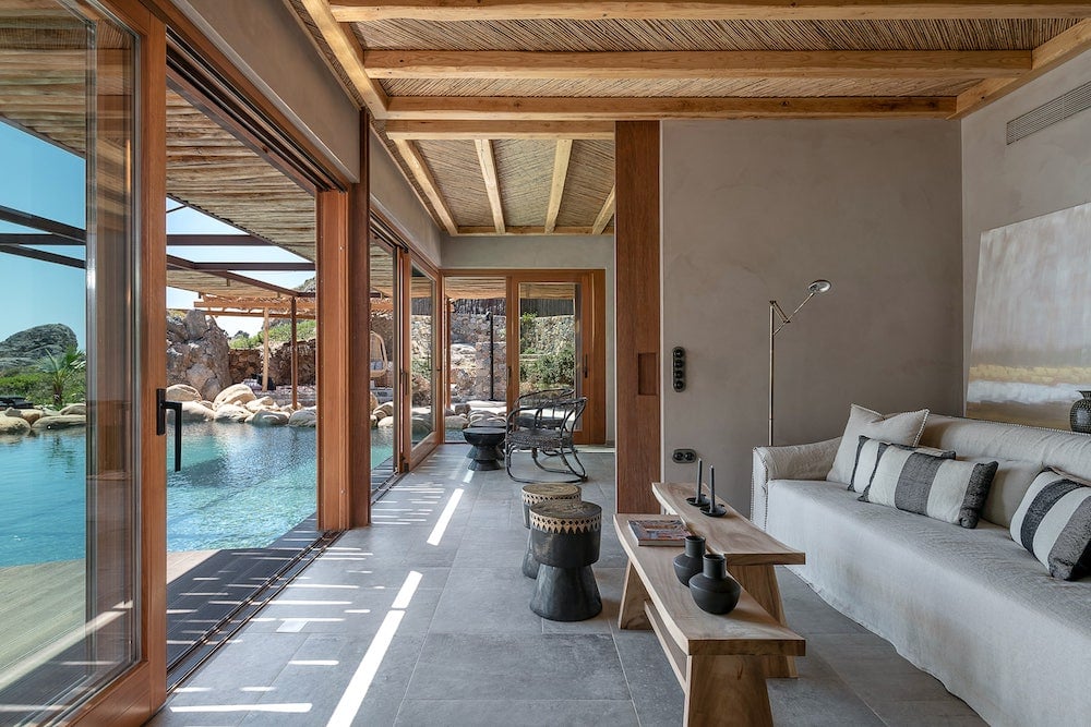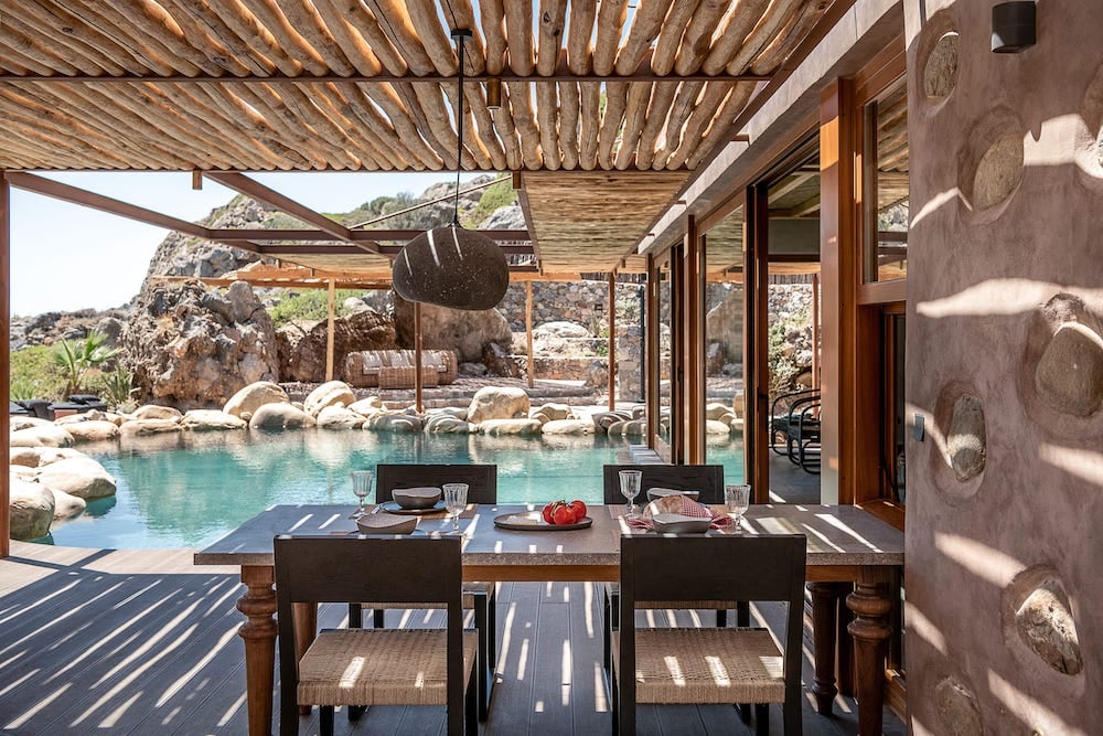 The 82 m² villa offers a spacious layout with two bedrooms (one double and one twin, with black-out roller curtains), two bathrooms, a living room, and an open-plan kitchen. The living room seamlessly connects to the stunning outdoor surroundings through a large open window overlooking a natural-style pool. The villa's décor is inspired by Cretan art, featuring lace covers on the beds and sofas with traditional Cretan patterns, pottery, and wooden accents that reflect the region's architectural heritage. This villa celebrates traditional craftsmanship and bohemian-style interior design, creating a relaxed yet luxurious atmosphere.