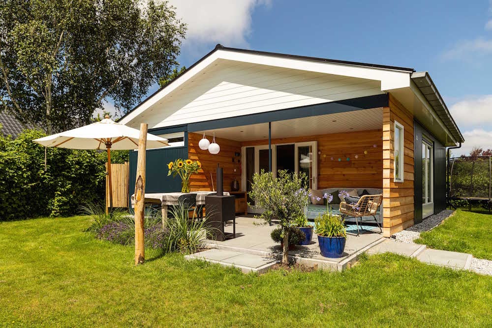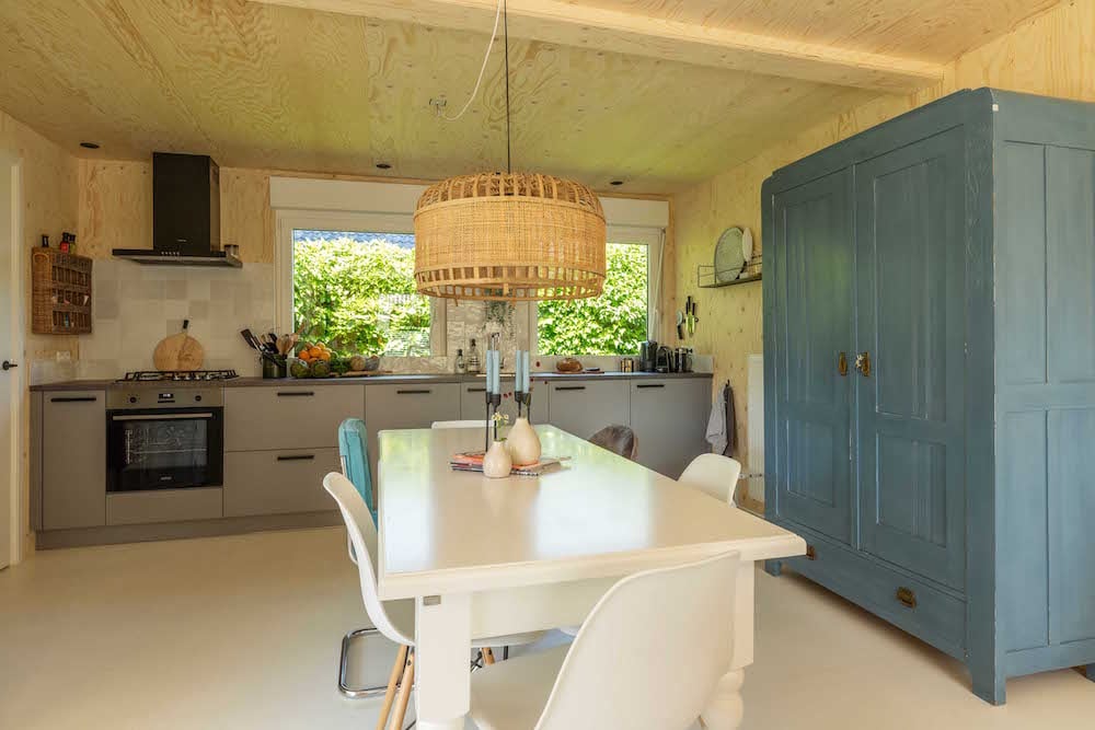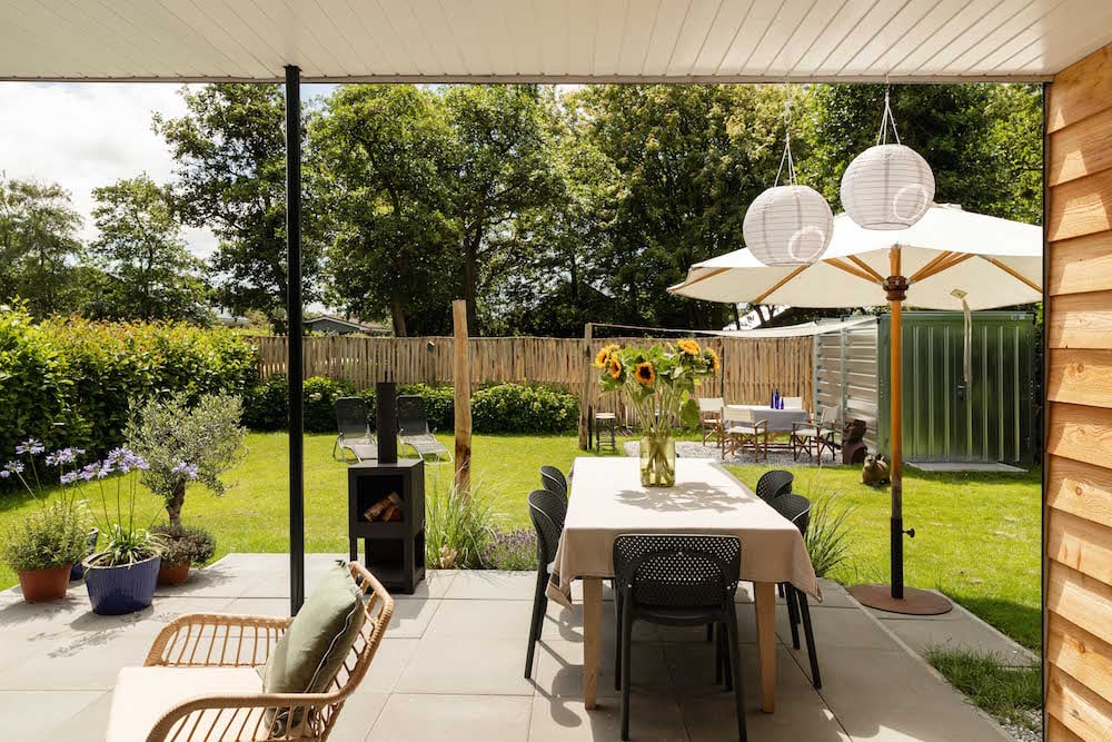 The French doors in the living room open onto the green, private garden of Nord312. In the garden there are 2 covered terraces and several sitting areas. There are lounge chairs to enjoy the sun, an outdoor shower for summer cooling and a large trampoline for the children. Also in the colder months, the garden is a lovely place to stay and you can light the outdoor stove to gather in the warmth of the fire. Because of the dense fence surrounding the garden, you have a lot of privacy. In the park you will find a restaurant, several playgrounds for children and a football field. The sea is within walking distance (20 min.), but can also be reached within a few minutes by car or bicycle. You can also drive to the cosy cities Alkmaar or Den Helder, walk through the dunes, woods or tulip fields, or spend a day on Texel for example.
