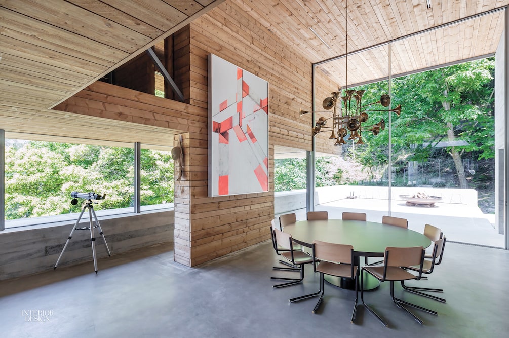 The living room is bordered by a terrace with a hot tub on one side and a terrace with a fire pit and lounge chairs on the other.