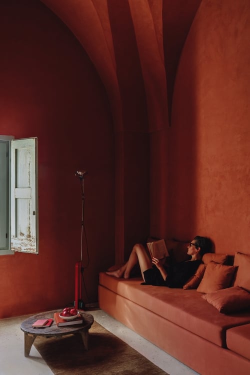 - The second suite features the original "cocciopesto" flooring, a plush king-size bed, and a private terrace. The sleeping area is connected to an additional reading room that can be transferred into two additional beds. There is also an en-suite bathroom with a sink, rain shower, and WC.