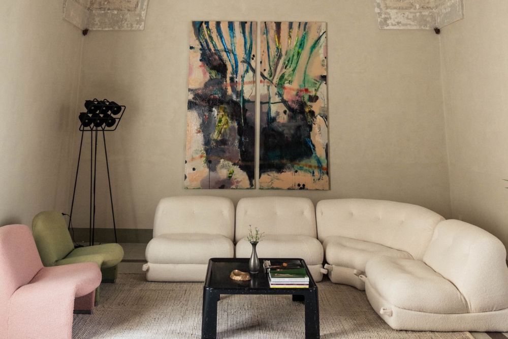 - Beautiful lounge in the old part of the palazzo with a lounge area with a designer sofa, a dining area with a custom-made stone table, and access to the (French) balcony