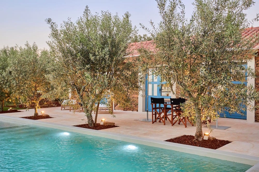 French doors from the living room and bedrooms open onto the garden which is surrounded by olive trees.