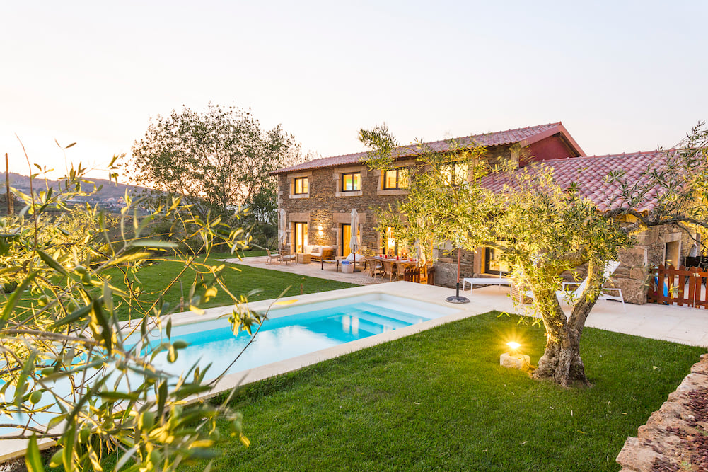 Large sliding doors from the living room open onto the green garden with the large swimming pool. The house is surrounded by a green landscape of vineyards, olive trees and small villages.