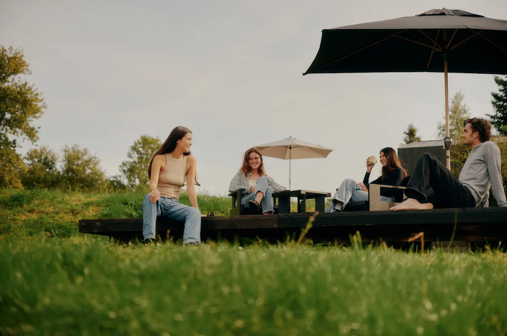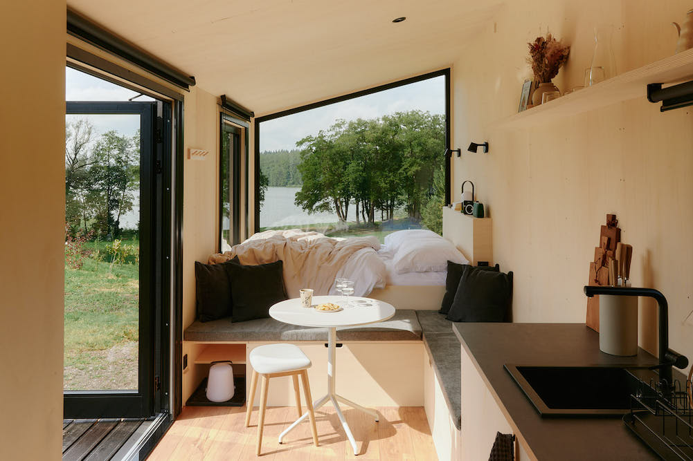Each 16-square-meter cabin is sustainably furnished and features an open kitchen, living and sleeping areas, a bathroom, and a sundeck. With easy access to hiking and biking trails in the UNESCO biosphere reserve. It is also possible to book all fourteen cabins at Lodge am See for up to 28 guests. Perfect for a getaway with friends, colleagues, or clients!