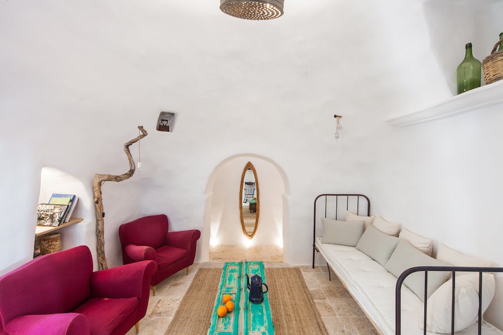 Trullo Grande is an ensemble of seven "cone roofs" and an alcove that sleeps up to six people. This Trullo has a spacious living room with a large sofa and two comfortable chairs. Two patio doors give access to the private terrace. The kitchen is equipped with an electric hob, a vintage fridge, a dishwasher, and a dining table with 6 chairs. There are three bedrooms, two have a double bed, and the third bedroom has two single beds. There are three bathrooms (one of which is ensuite). They are all equipped with a spacious walk-in shower, toilet, and remarkable washbasins in stone or recessed in wood.