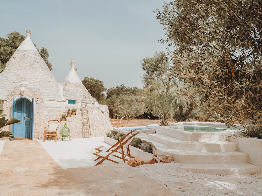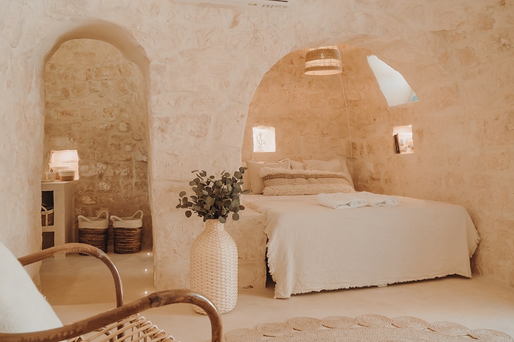 Authentic details have been preserved and combined with the typical white color of Puglia, earthy materials and soft fabrics. Each room has its own 'cone', so a romantic niche has been created for the double bed and the bathroom has a 'cone' too for more privacy. In the central room there is a comfortable sofa bed for 2 guests. Because of the traditional structure with thick walls, the heat stays outside and the coolness inside and otherwise the air conditioning will do the job.