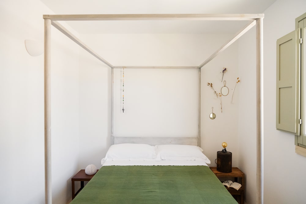 Through a small hallway, you reach the back of the “trullo” where the bathroom and two bedrooms are located. There is one bedroom with two single beds and one bedroom with a four-poster bed (140x200cm). The owners have deliberately chosen not to place a TV in the house, but it does have Wi-Fi internet.