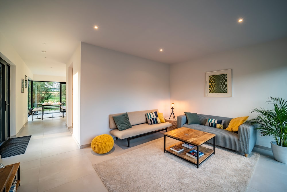 - An open plan living with on the right a cozy lounge area with two sofas, a cable TV and access to the evening terrace