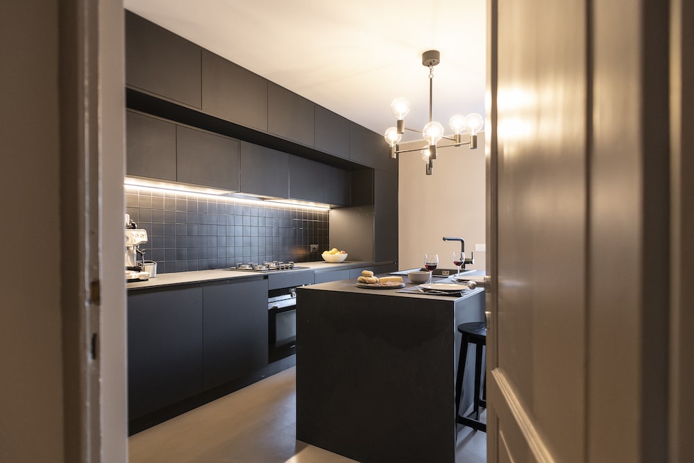 - modern kitchen with cooking island, luxury espresso machine, oven and dishwasher
