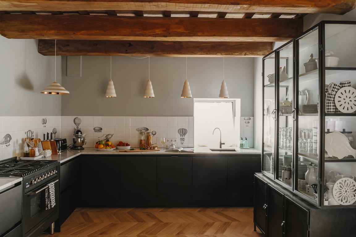 - A fully equipped kitchen, half separated from the dining room, with an American fridge, Boretti oven, Jura coffee machine, Smeg and Kitchenaid appliances, hob, kettle, dishwasher, toaster, and a blender.