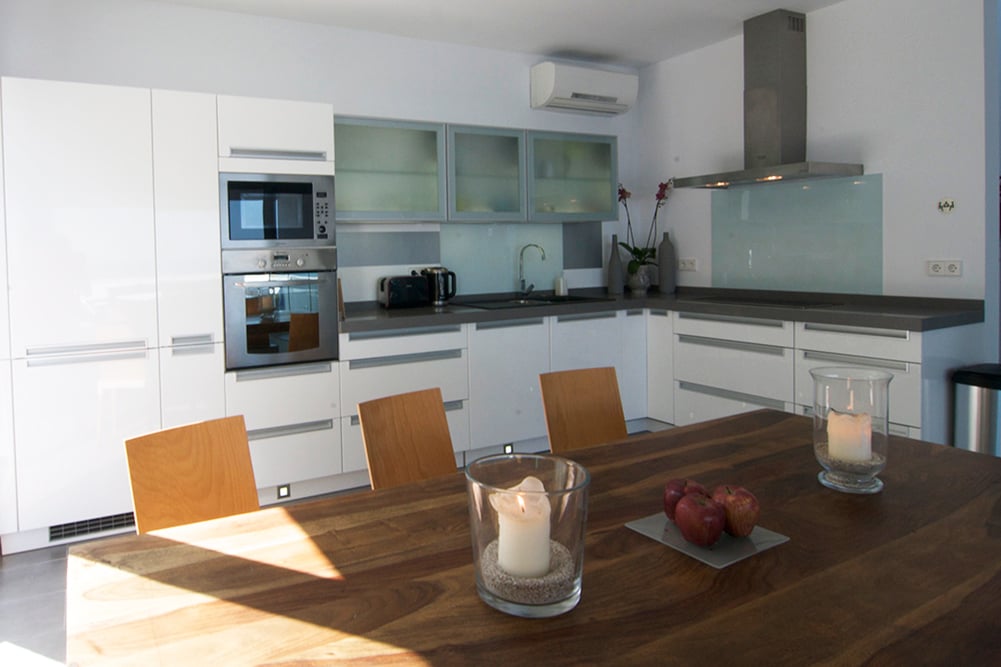 - A central hall connects the different rooms and also offers access to the kitchen. The kitchen is located inside the central, sunlit part of the house and is equipped with all the modern amenities and necessities for preparing your own meals. There are two dining tables, one inside the house and another one on the covered terrace.