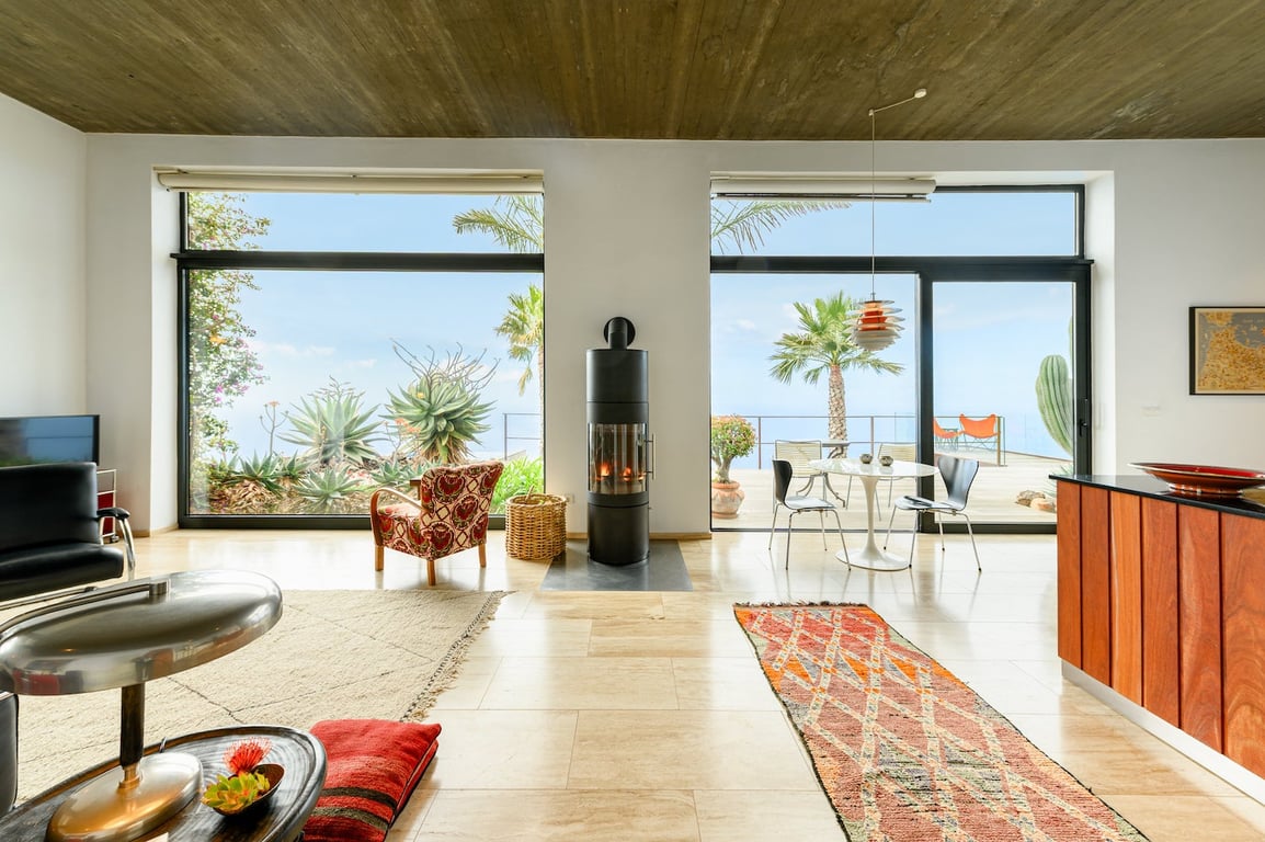 - An open-plan living/dining area with a designer sofa, chairs, a television, and a wood-burning stove. The living room provides access to the covered terrace