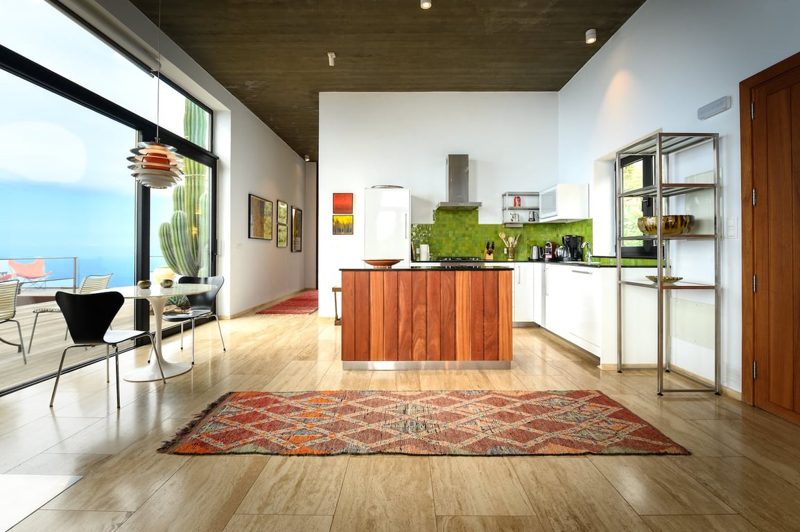 - An open kitchen equipped with a round dining table and all modern appliances, such as a cooker, dishwasher, coffee machine, kettle, oven, fridge, toaster, and sufficient kitchen utensils.