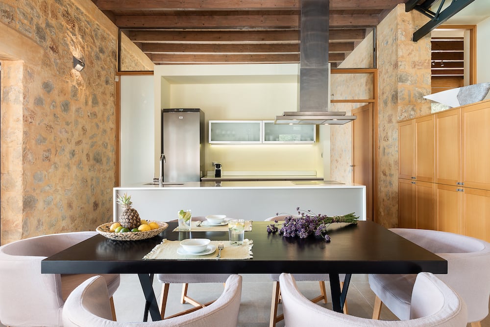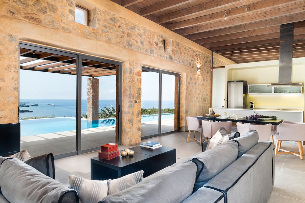 The villa has an open plan living with a comfortable sofa and two large patio doors that offer stunning views of the pool. On the other side of the living room is the oak kitchen with a cooking island and a freestanding fridge. Modern equipment includes a cooktop, a dishwasher, an oven, and a Nespresso coffee machine. Between the kitchen and the seating area is a dining table for eight people. At the back of the living room brings a short staircase you to a corridor leading to a bedroom with a double bed and patio doors with unsurpassed views of the sea. The room also has an ensuite Jacuzzi-bathroom with sink and toilet.