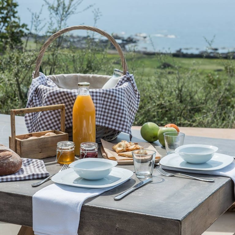 - In the morning, breakfast is served at the outdoor table and can be enjoyed at any time until noon. For lunch and dinner, meals can be ordered from a nearby tavern.