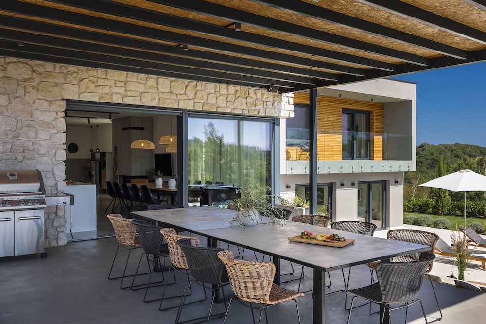 - A few steps up from the pool is a covered patio with a dining table for 14 people and a barbeque.