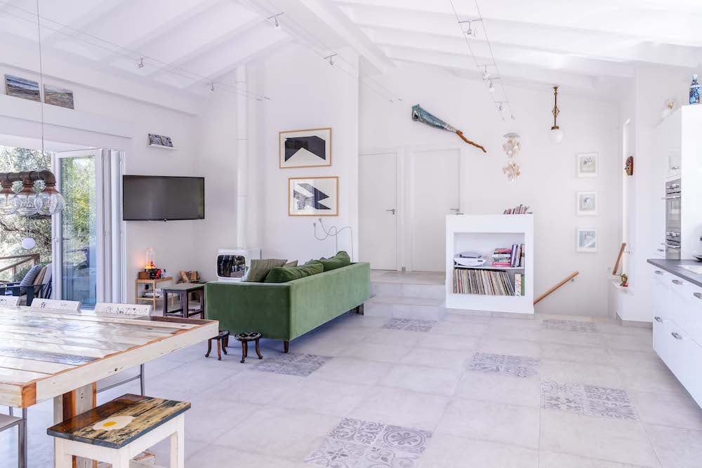 - Bright, spacious living room (30 m2) with 3-seater sofa next to the wood burning stove and sliding doors that open out onto the covered terrace. An old-fashioned record player has also been provided for the more nostalgic guest…