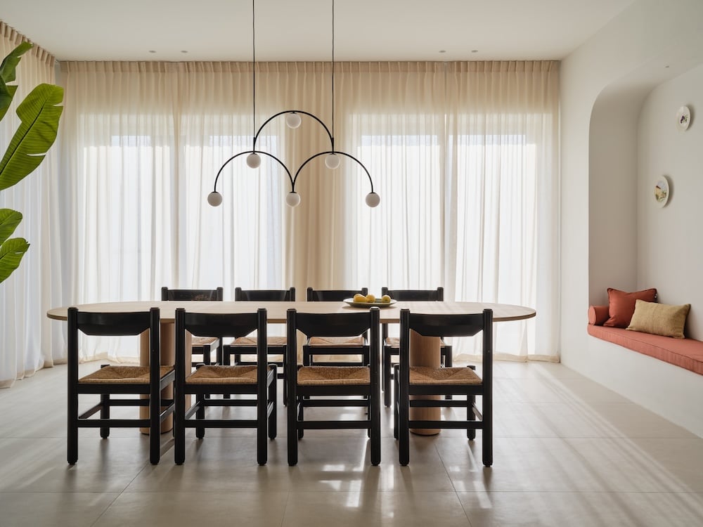 - Dining area with a 3.20-meter-long Arco dining table and Vico Magistretti chairs, and a cozy alcove.