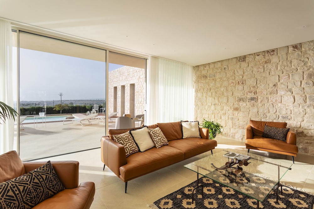 The interior of Villa Trifilla is tastefully decorated, combining modern comfort with traditional Sicilian charm. The spacious living areas are filled with natural light, and the fully equipped kitchen offers all the amenities needed for a comfortable stay. The villa features four bedrooms, one of which has a single bed, and four bathrooms, ensuring privacy and comfort for everyone. The villa is characterized by elegant decor, high-quality finishes, and attention to detail, creating a warm and inviting atmosphere.
