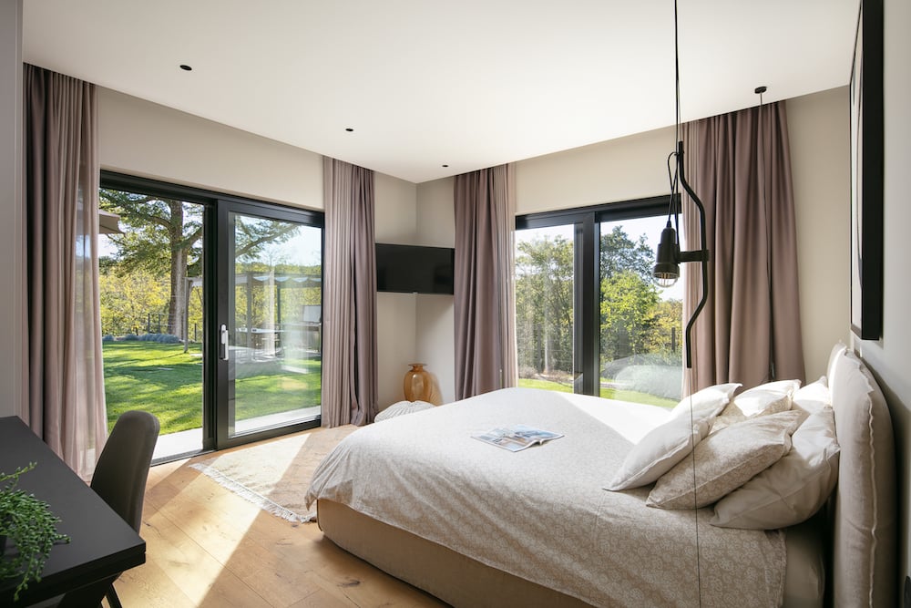 - Master bedroom with a double bed and large panoramic windows through which you can access the garden.