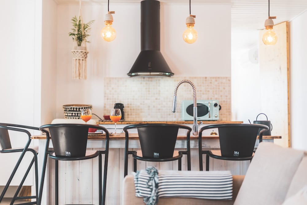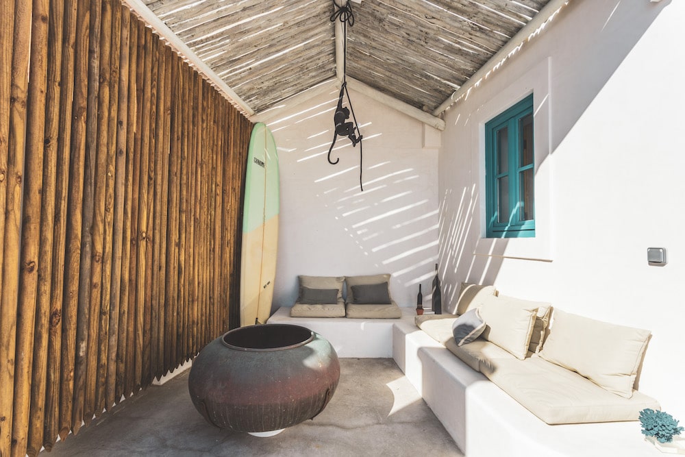 Villa 10 | 40 m2 | 2 adults + 2 children kitchen with bar stools, lounge area with sofa bed (comfortable and queen size), fireplace, bedroom with double bed, bathroom with rain shower. Cottage on the top floor with sea view | at the entrance you have a sofa to chill outside