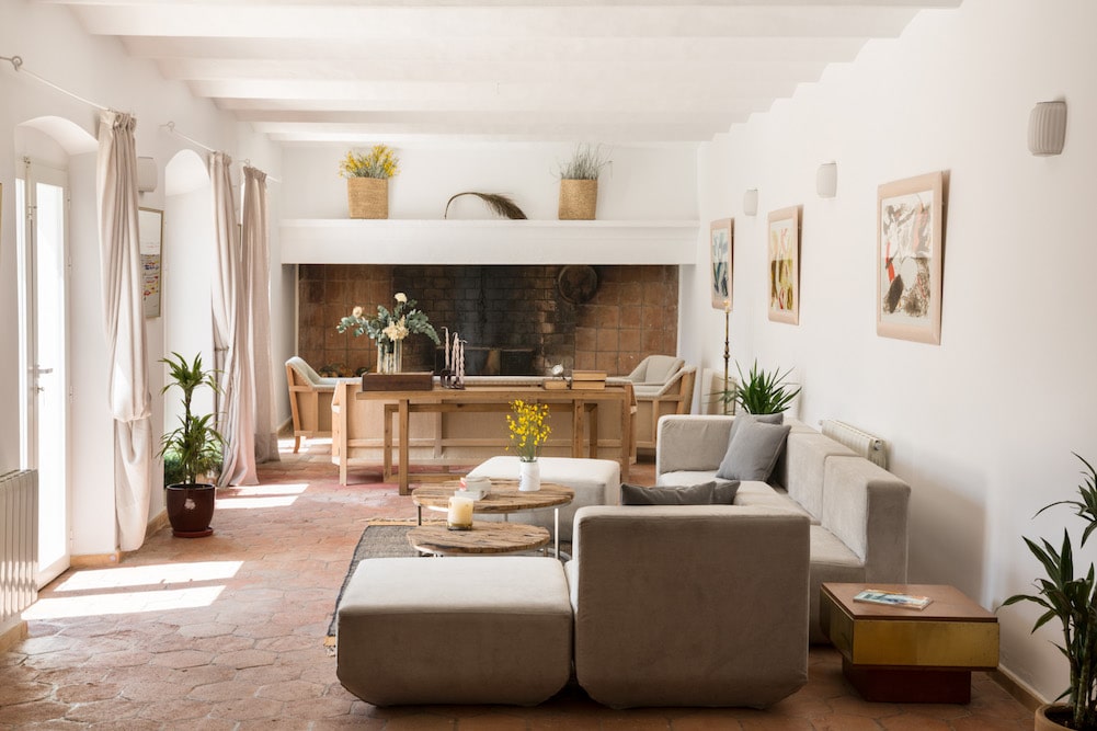- Woonkamer met een opvallende grote open haard! Rond het vuur kunt u comfortabel zitten op banken en fauteuils. Een reeks modulaire banken die in het midden van de kamer zijn opgesteld, creëren een tweede zithoek. De woonkamer opent op de binnenplaats.