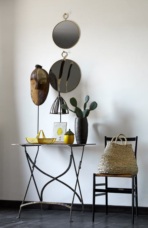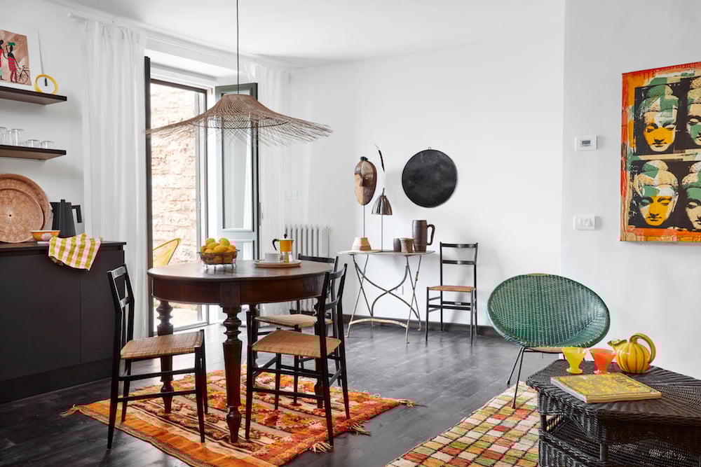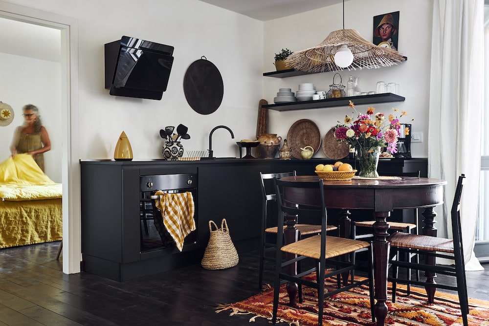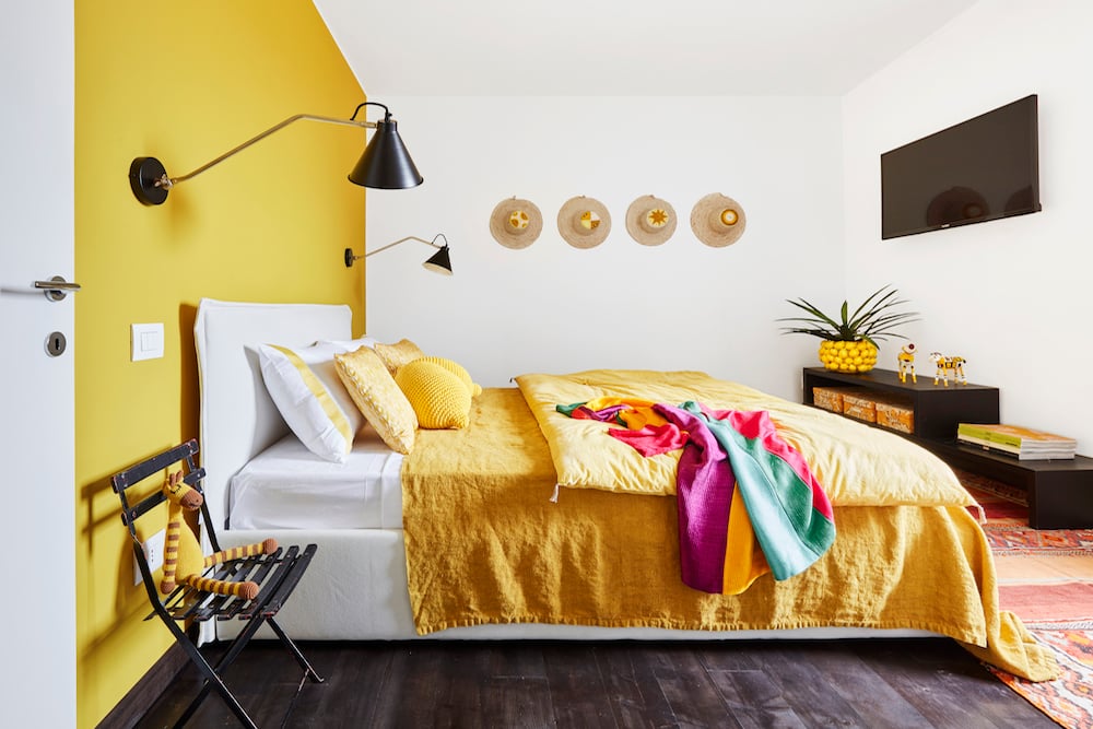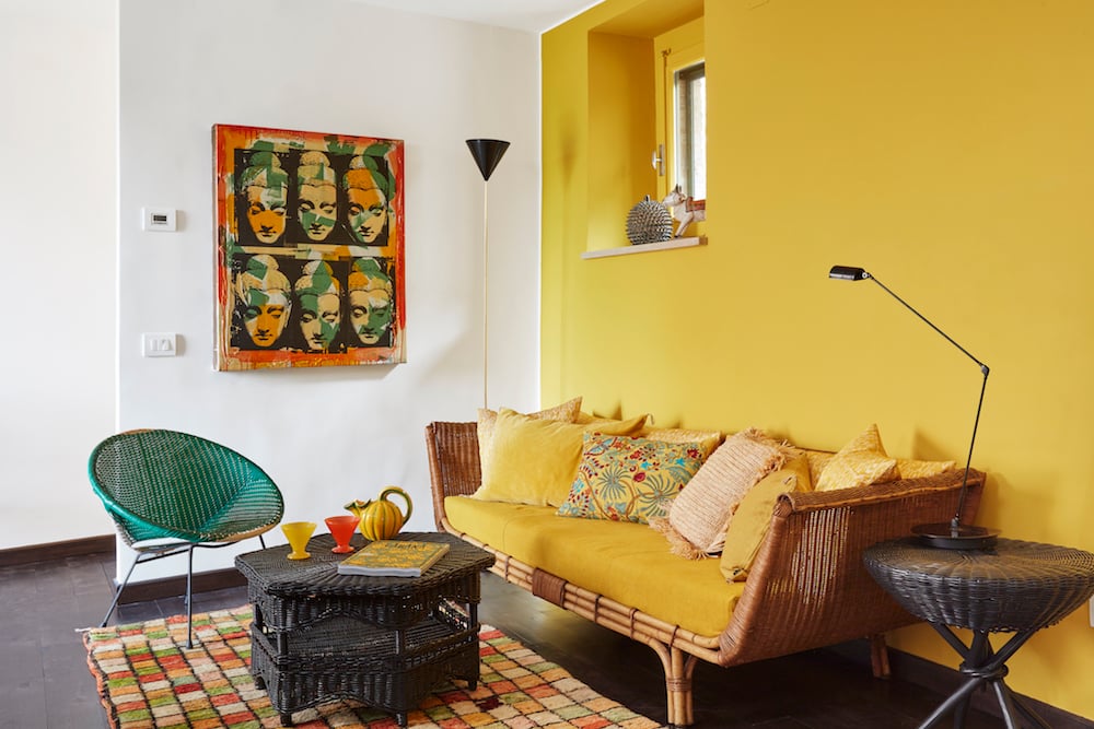 - Vanuit de voordeur brengen een paar treden u naar een open leefruimte. In het zitgedeelte (met een zonnige gele muur) staan een rieten bank, een stoeltje en enkele bijzettafeltjes.