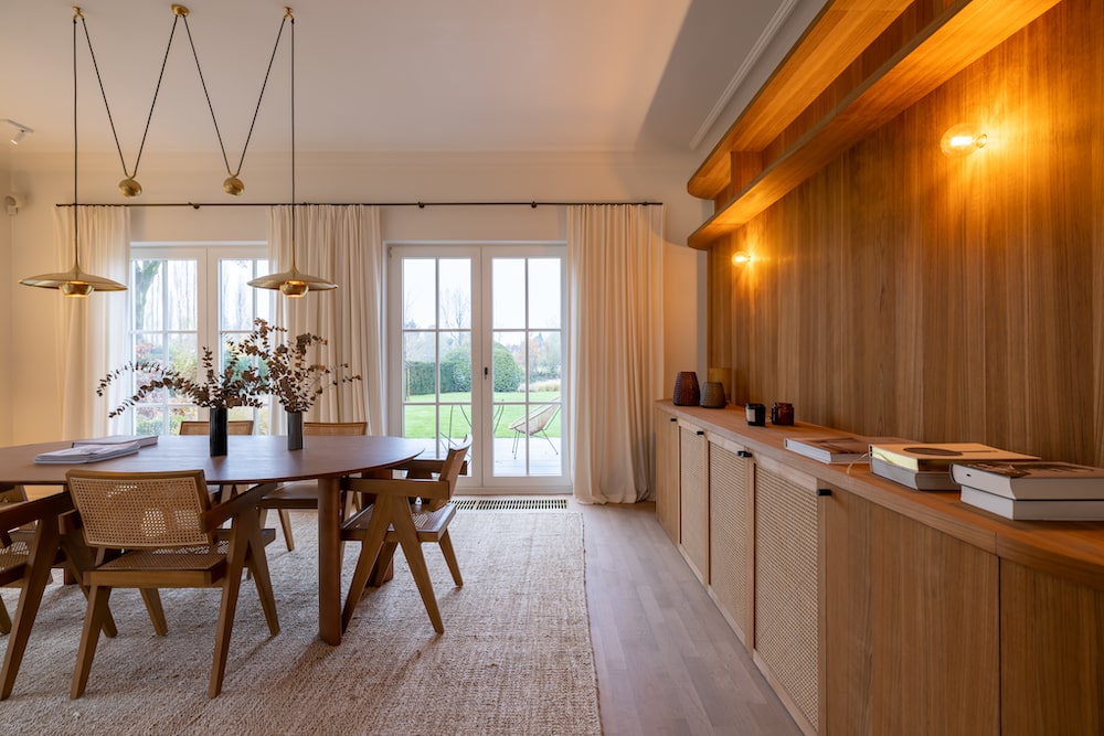 - Woon/eetkamer met aan de ene kant een zithoek met een organisch gevormde bank en een open haard. Aan de andere kant staat een ruime houten eettafel. Er zijn tuindeuren aan beide zijden die openen naar buiten