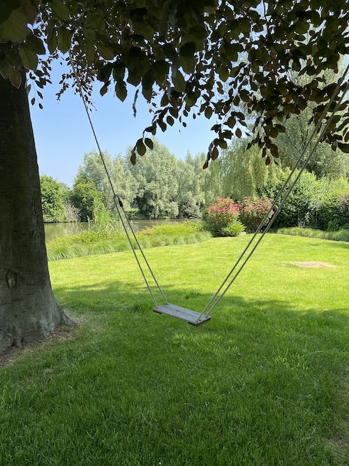 - Achtertuin met goed onderhouden grasveld, een schommel en direct toegang tot de Leie