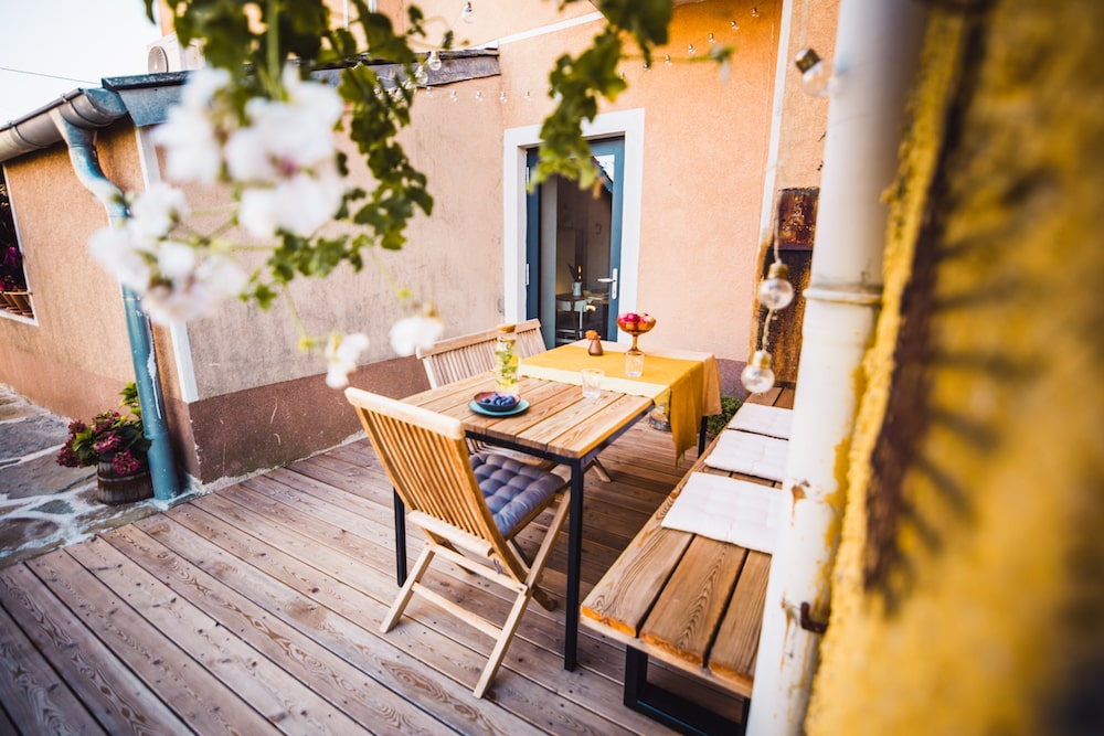 - Naast het huis ligt een houten privé terras met een eettafel voor 8 personen en een draagbare barbecue