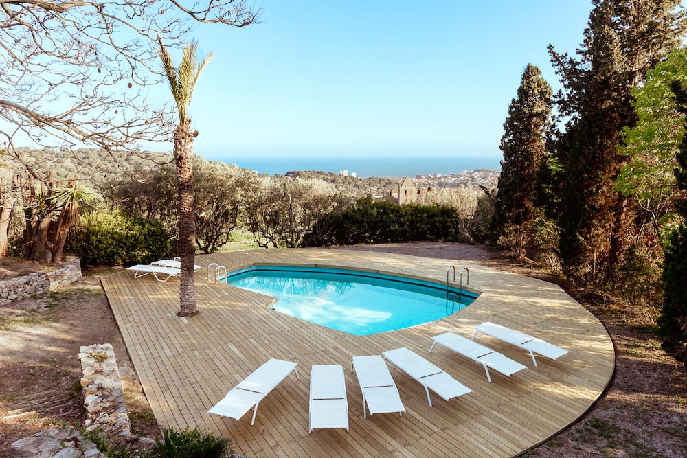 - Grote groene achtertuin met verschillende niveaus, volledig bedekt met gras, enorm veel mooie bomen en een heerlijk zwembad waar 8 ligbedden bij zijn geplaatst. Vanaf hier geniet u van een prachtig uitzicht over stad en zee.