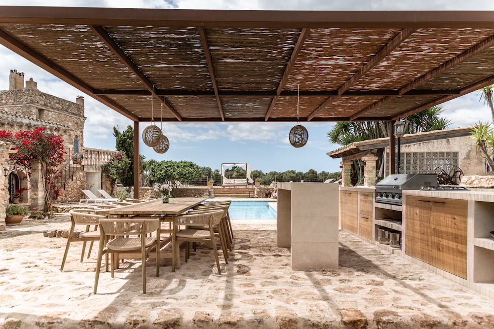 - Overdekte eettafel voor 10 personen en een buitenkeuken, volledig uitgerust met een koelkast, vaatwasser, gasfornuis en ingebouwde gasbarbecue (Weber).