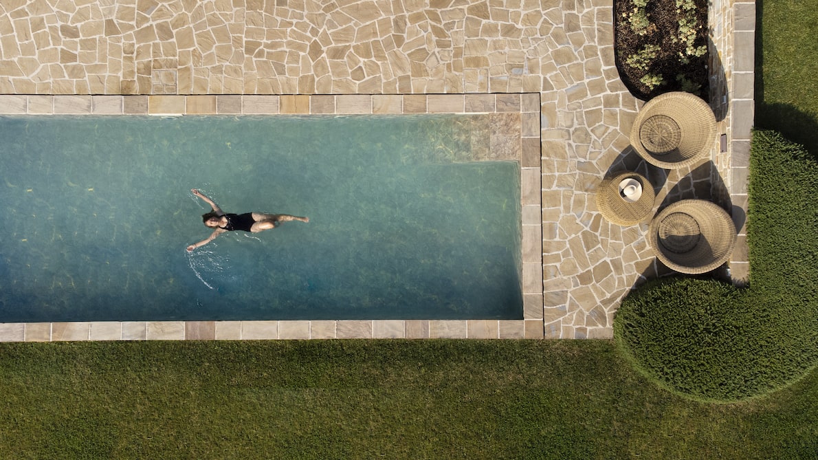 - Pergola bij het zwembad met verstelbare ligbedden, loungezetels, gemakkelijk verplaatsbare zeteltjes en plooistoelen.