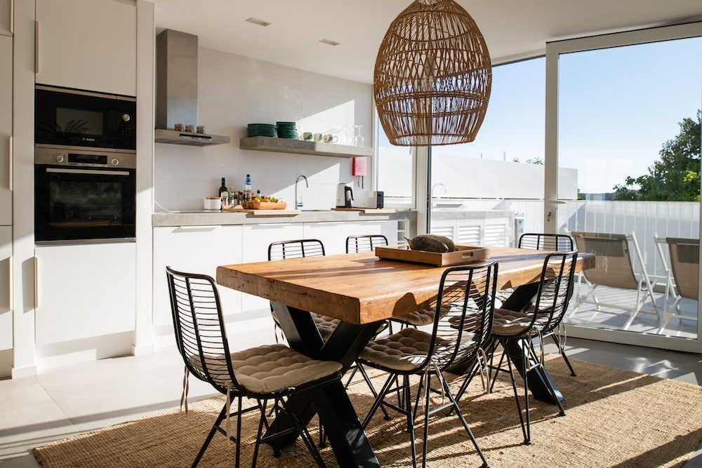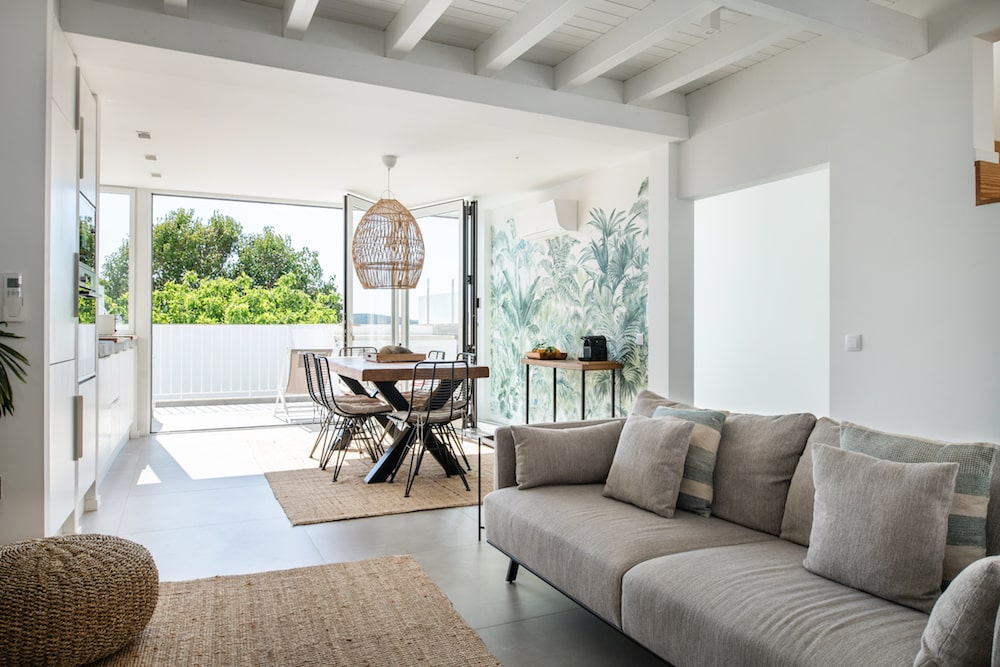 - In de woonkamer gaat een houten trap naar boven naar de ensuite masterslaapkamer met een queen-size hemelbed (160x200cm), kastruimte, een ensuite badkamer en een panoramisch balkon.