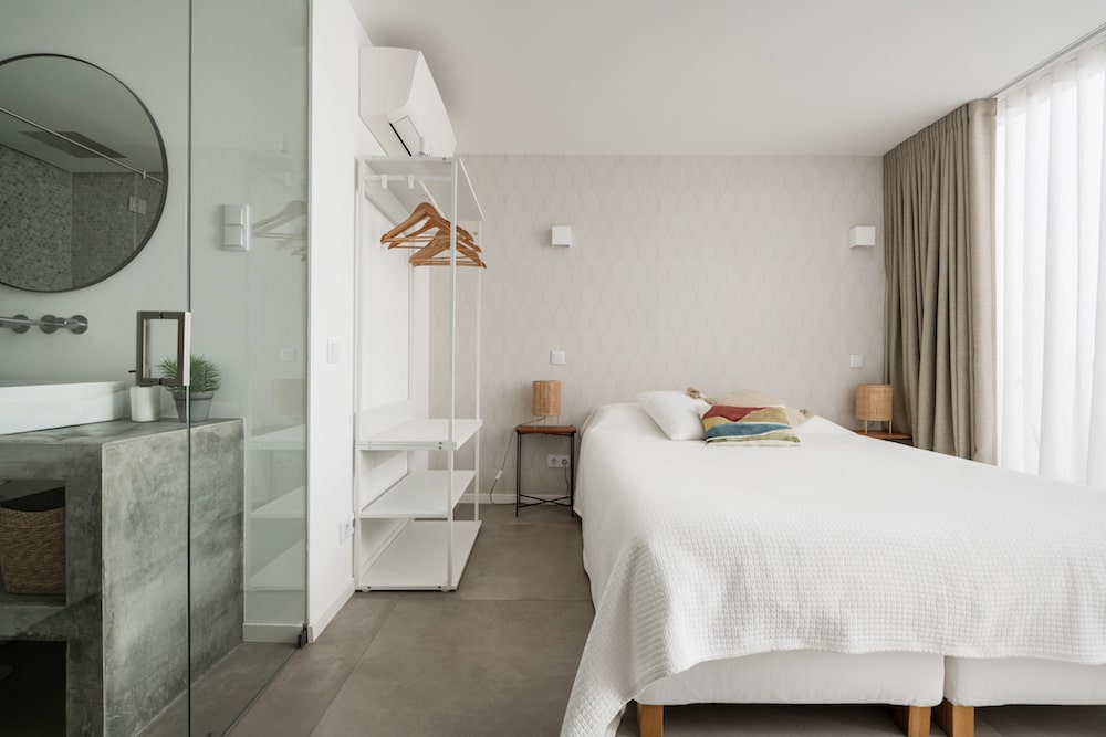 - De andere twee slaapkamers bevinden zich op de beneden verdieping (-1 verdieping). Een kamer heeft een queen-size bed (160x200cm) en de andere heeft een 2-persoonsbed (140x200cm) die ook als twee enkele bedden kan worden opgemaakt. Beide slaapkamers hebben toegang tot een kleine (binnen) patio met buitenmeubilair. Tevens beschikken beide slaapkamers over een ensuite badkamer.