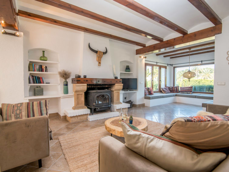 - de living is een mooie lichte ruimte met gewelfde plafonds en houten plafondbalken. Er zijn verschillende zitjes; zo kunt u met het hele gezelschap rond de open haard of lekker een boek lezen in de grote lounge met Marokkaanse kussens en uitzicht naar de tuin