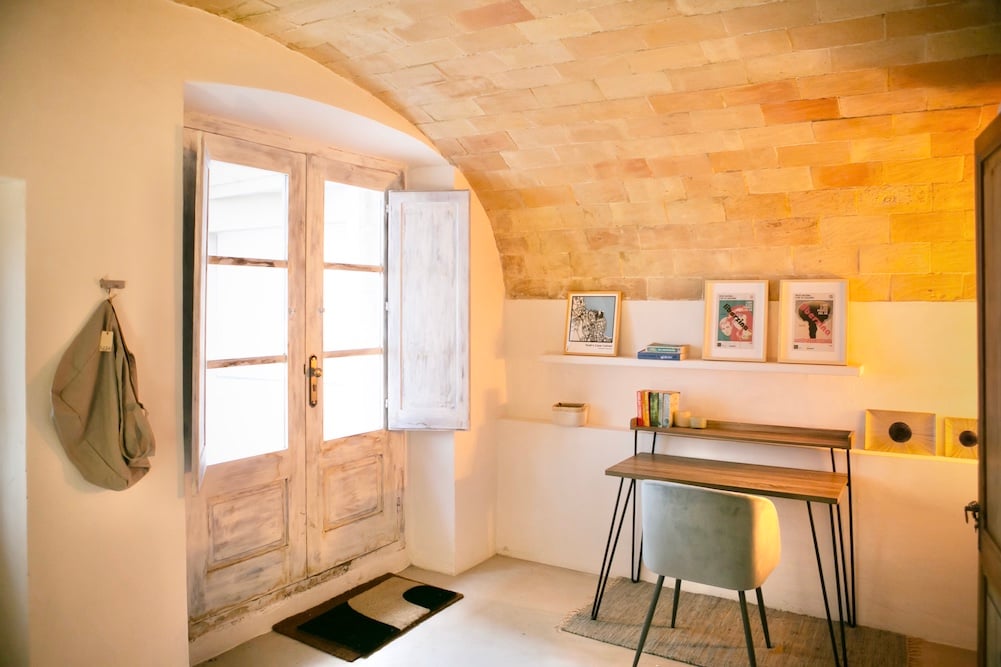 - Bij binnenkomst betreedt u de hal die is uitgerust met een leuke cocoon-stoel en een bureau.