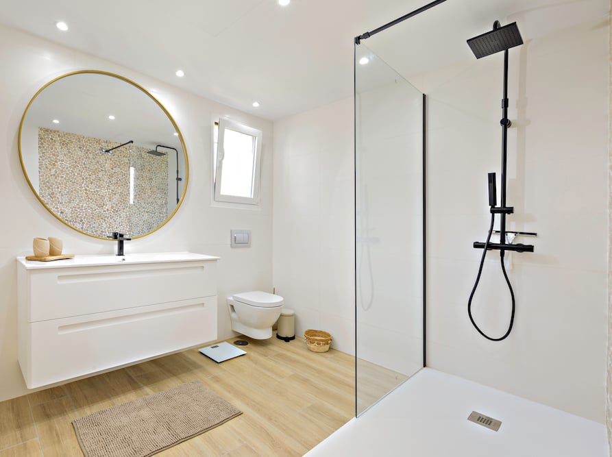 - Via de entree komt u binnen in de open living met aan uw linkerhand de eerste badkamer, uitgerust met douche, toilet en wastafel.